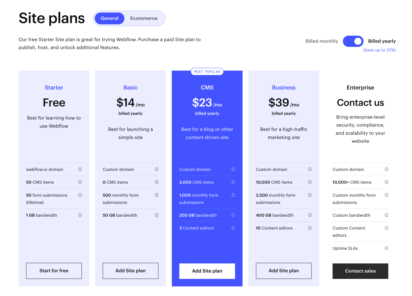 Wie bereits eben angerissen, ist beim Basic Plan die komplette CMS Funktionalität von Webflow deaktiviert. Wer seine Website regelmäßig mit neuem Content versorgen will, der investiert am besten in ein Jahresabo für den Webflow CMS plan - und zahlt dabei 23$ im Monat (ca. 21,50€). Wem das zu billig ist, kann man auch einfach monatlich buchen und darf dann 6$ mehr zahlen.